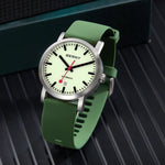 3. Stylish and Minimalist Design: The watch boasts a clean and eye-catching design inspired by classic Swiss railway clocks. It features a super luminous dial with a quick adjustment calendar window at 6 o'clock, 3D three-dimensional bar scale markers, and a striking red seconds hand with a circular luminous disc.